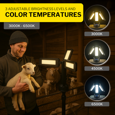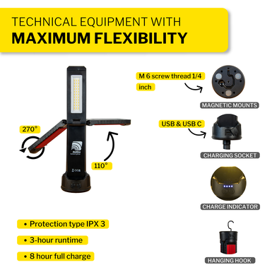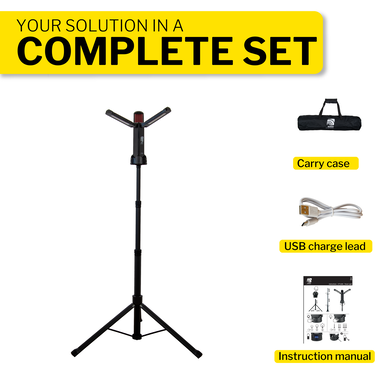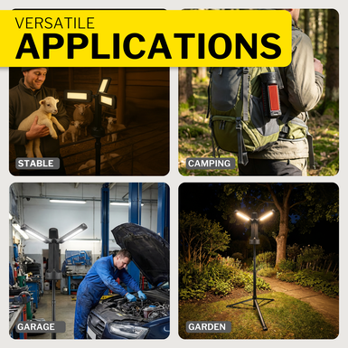 Rechargeable 6000-lumen lighting with three adjustable lamps, brightness and warmth settings. Complete with aluminium tripod, magnetic mounts, hanging hook, USB charging, and carry case for easy use anywhere.