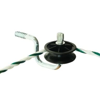 Straining pulley insulator for corners and end terminations. Can be securely screwed into any wooden post. Suitable for polywire, galvanised wire and rope up to 7mm.