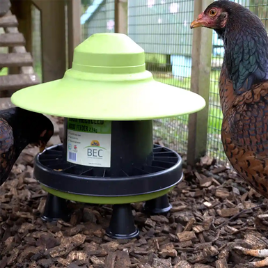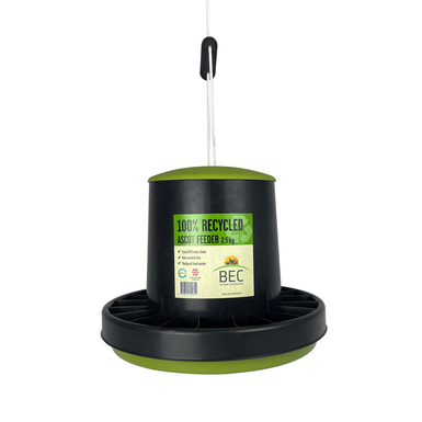 The Ascot feeder is the perfect small poultry feeder, this feeder is manufactured from 100% recycled plastic and is suitable for both indoor and outdoor use. This robust feeder features a simple twist and lock design allowing for easy filling and cleaning. It comes with built-in anti-scratch fins, which reduce feed waste and minimise contamination. This feeder has a securely fitting rain hat that provides protection from the elements and prevents birds from fowling feed. The Ascot feeder is adaptable for use with free range birds as well as birds that are kept in a more confined environment, the compact design allows for its use even in the smallest coops when space is at a premium.